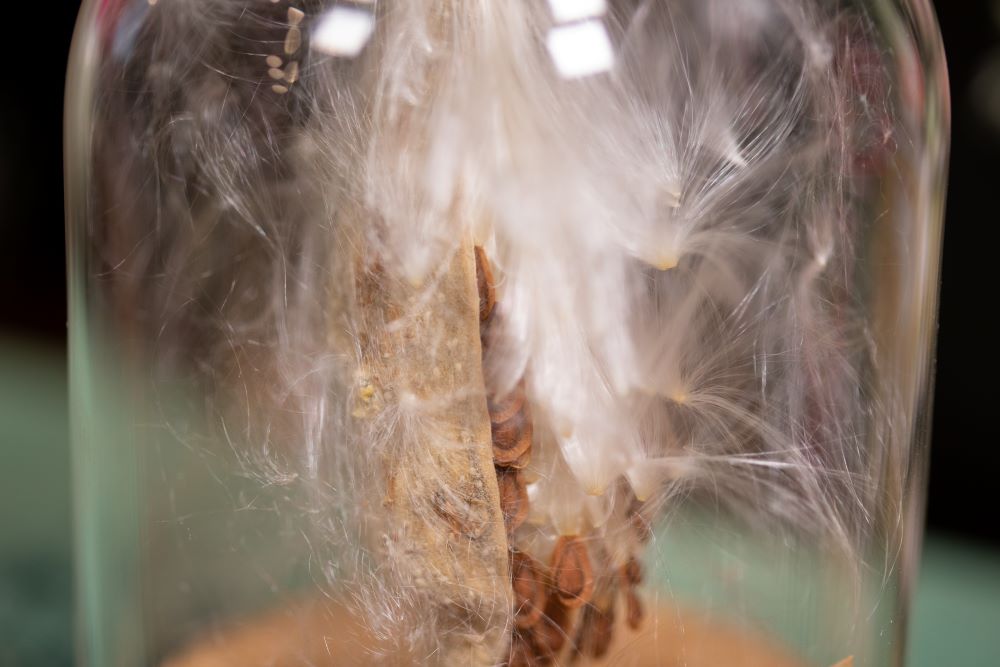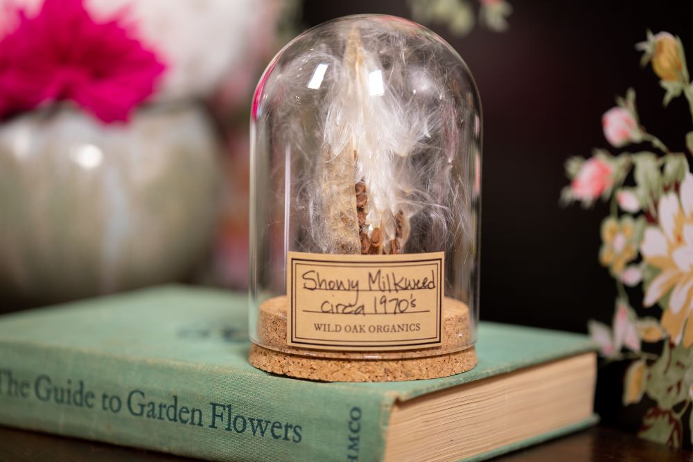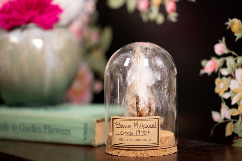 This item is an actual opened Showy Milkweed seed pod from 1968, the 1970's, or 1978 displayed in a small, skinny small, or large cloche. Our family still resided on Long Island, NY prior to 1984, so these were most likely picked and freeze dried on our former farm.
