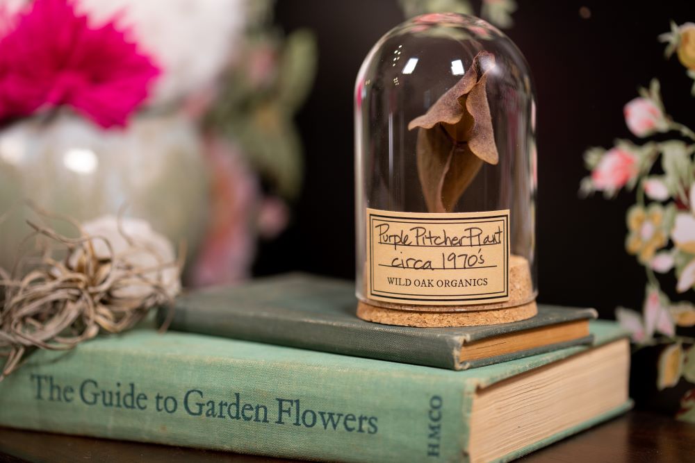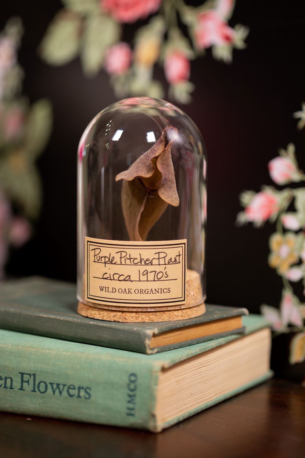 This item is an actual Purple Pitcher Plant from the 1970's displayed in a small or large cloche. Our family still resided on Long Island, NY prior to 1984, so these were most likely picked and freeze dried on our former farm.