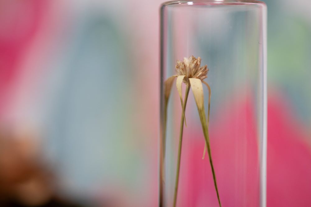 Sand and/or freeze-dried flower or plant material (possibly dyed pre-dry), glass, cork, label, and ink. Also possibly includes glue, wood skewer or stick, or taxidermy needle.