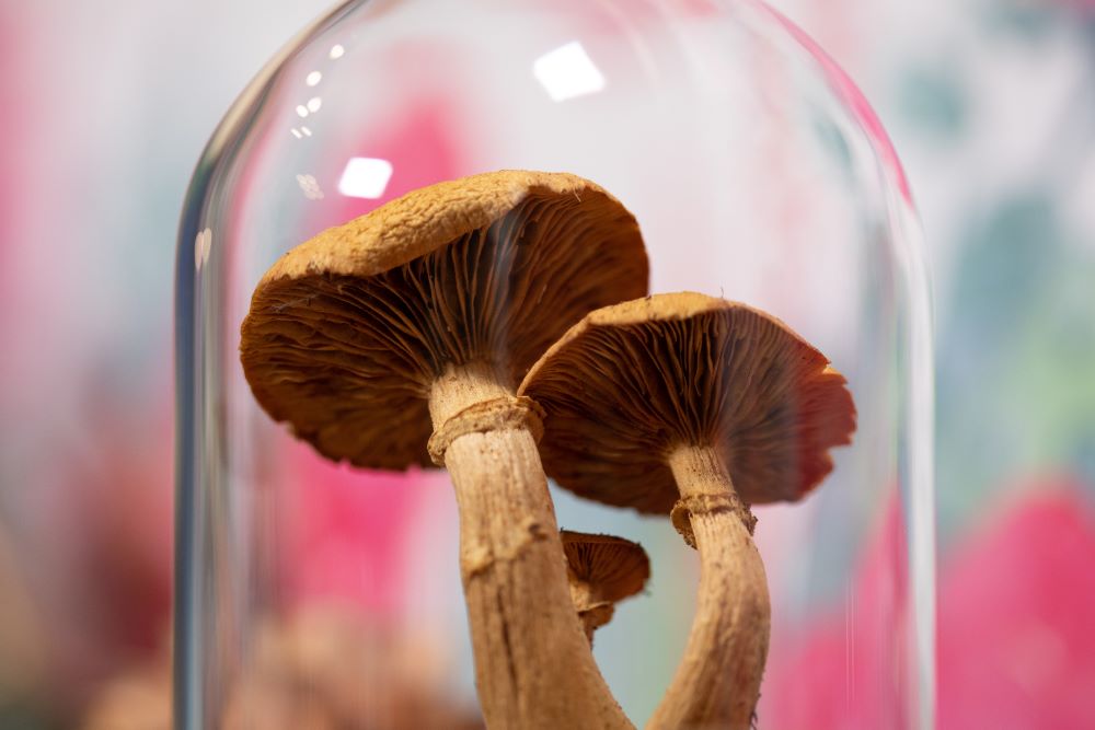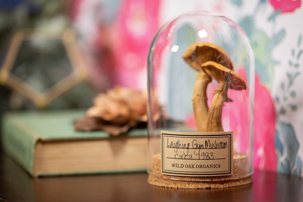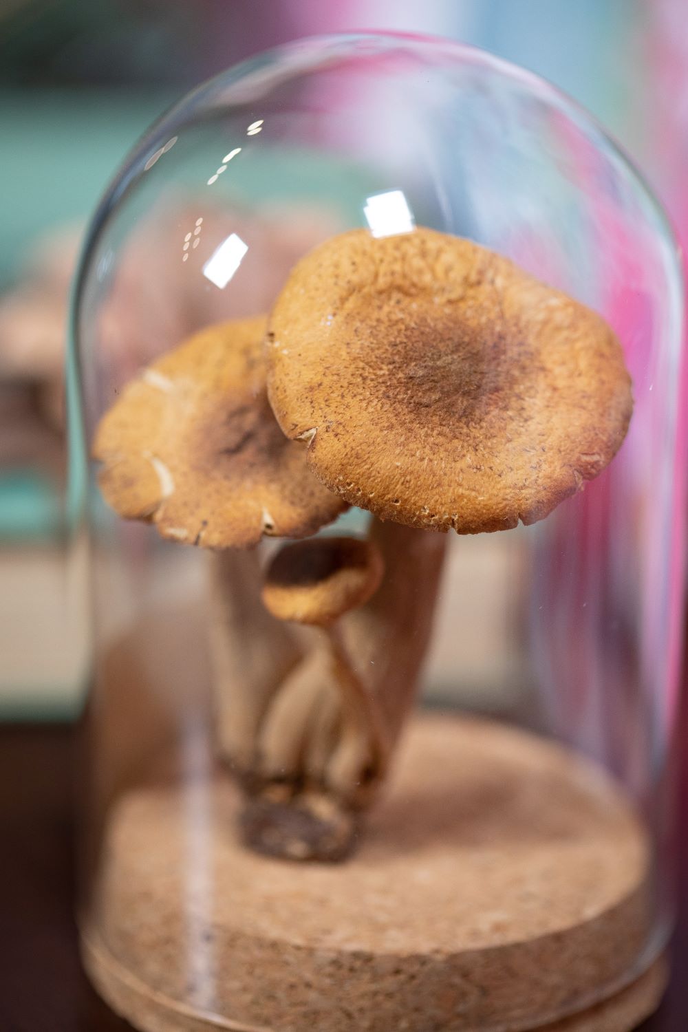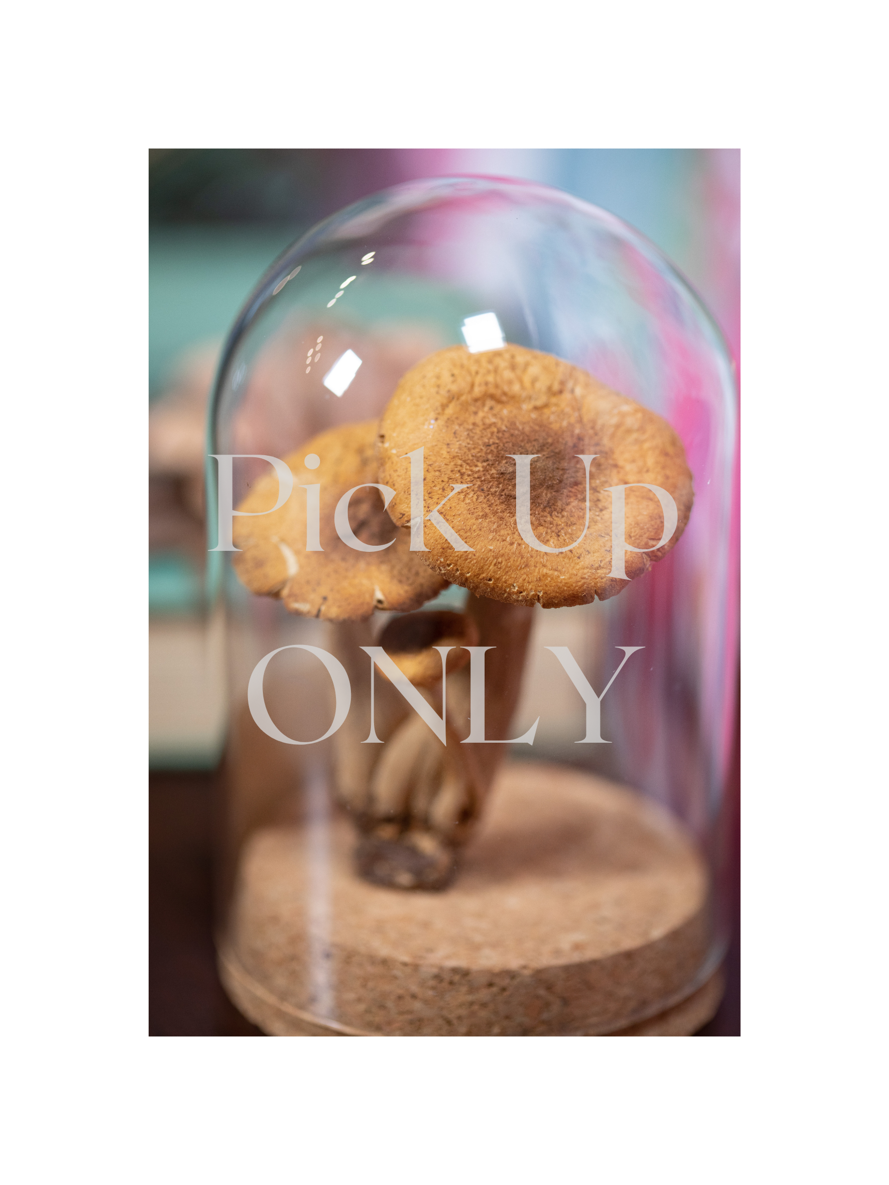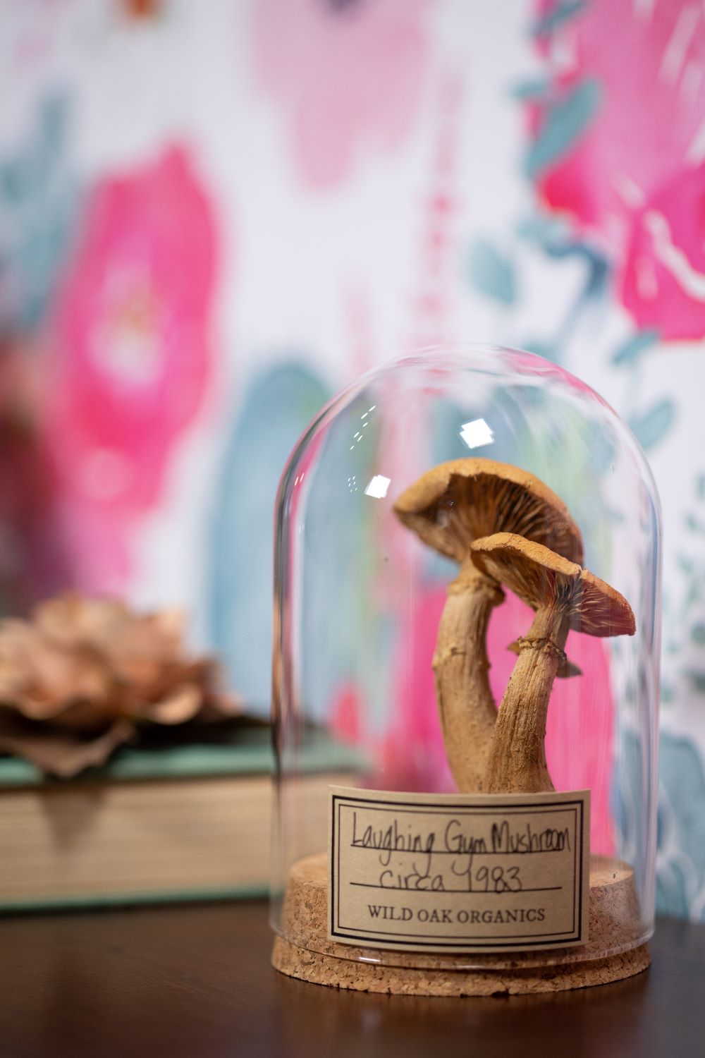 This item is an actual Laughing Gym Mushroom displayed in a small, skinny small, or large cloche. These were most likely foraged on one of my father's trips back to the East Coast.