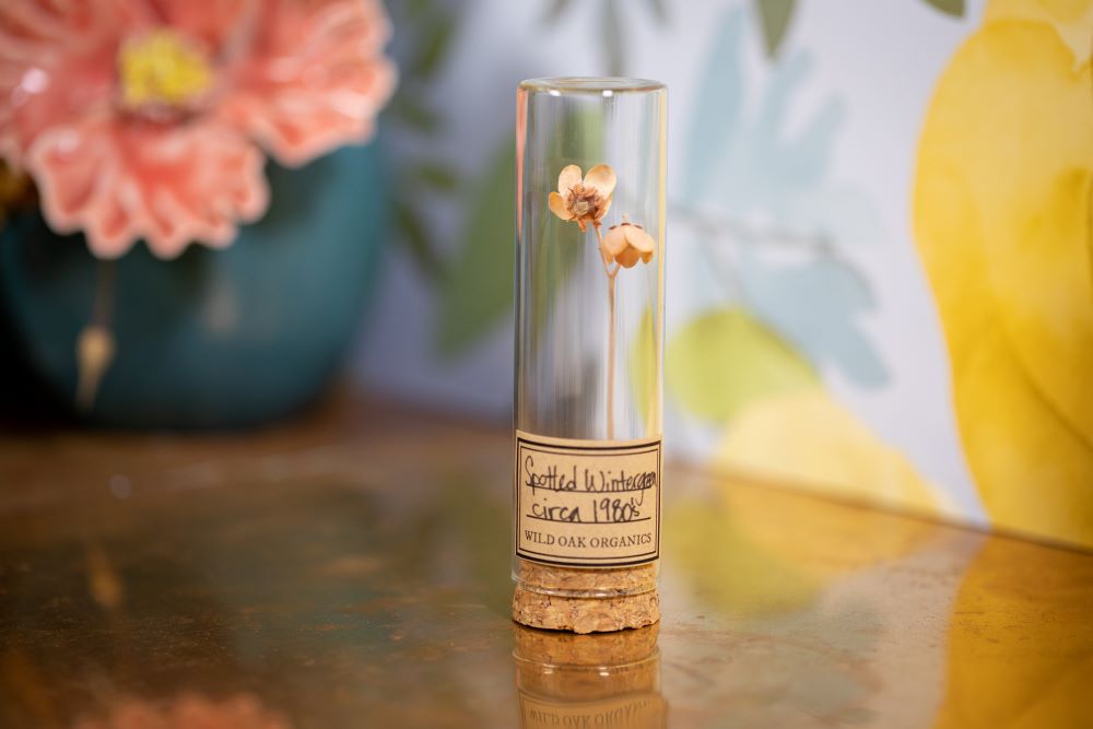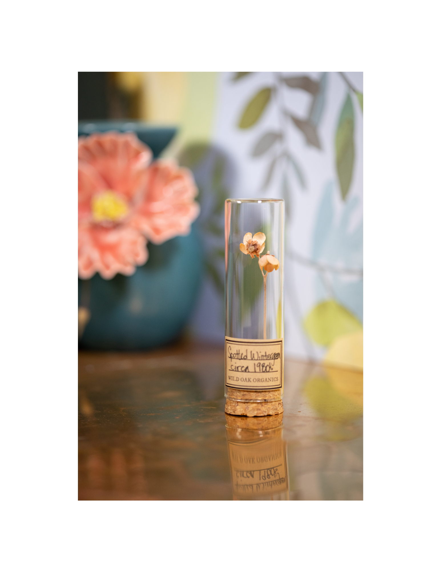 This is an actual stem of Spotted Wintergreen from the 1980's displayed in a glass vial. These flowers were most likely grown on our farm in San Diego.