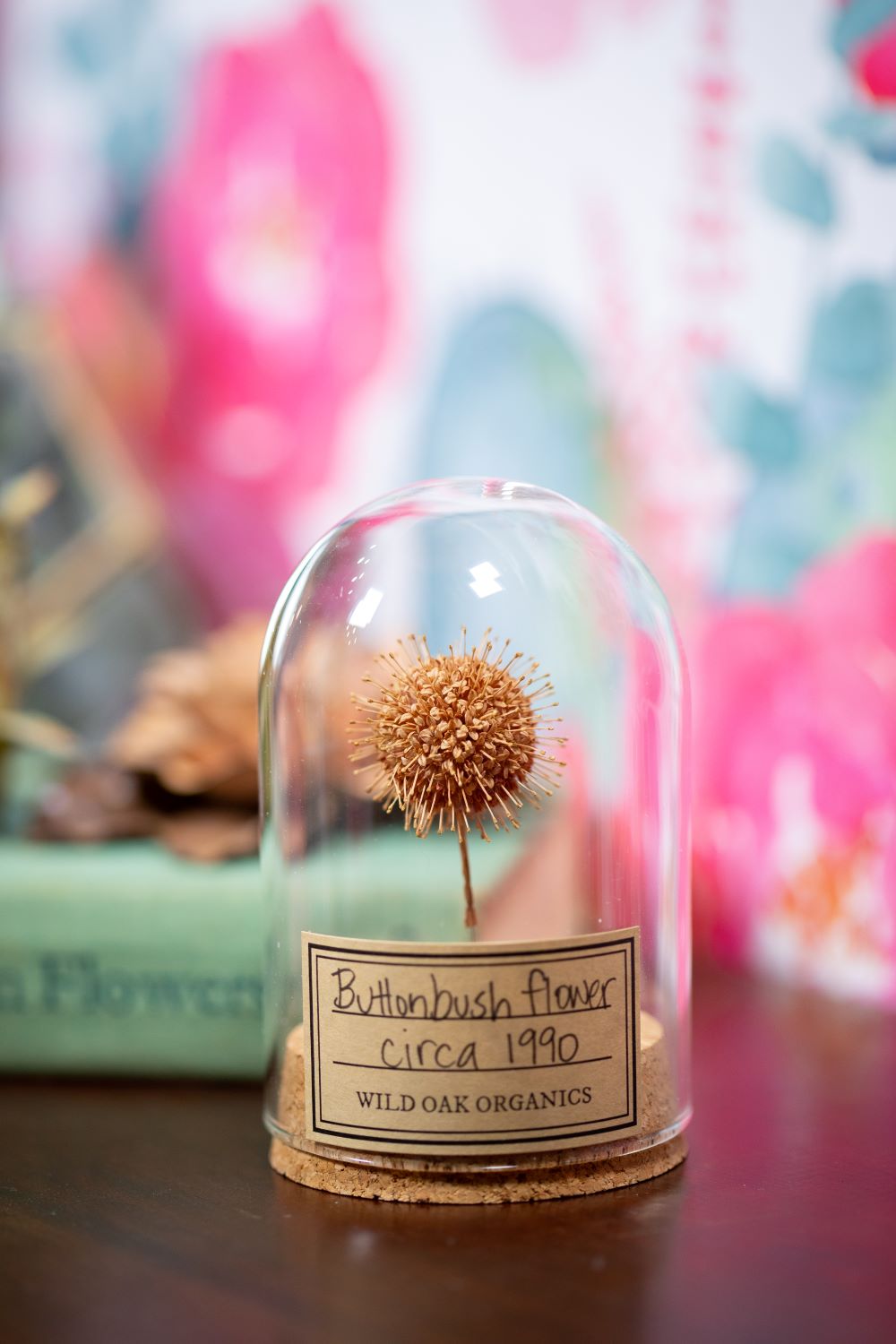 This is a stem of Buttonbush flowers from 1990 and are displayed in a small cloche. These flowers were grown on our farm in Southern California.