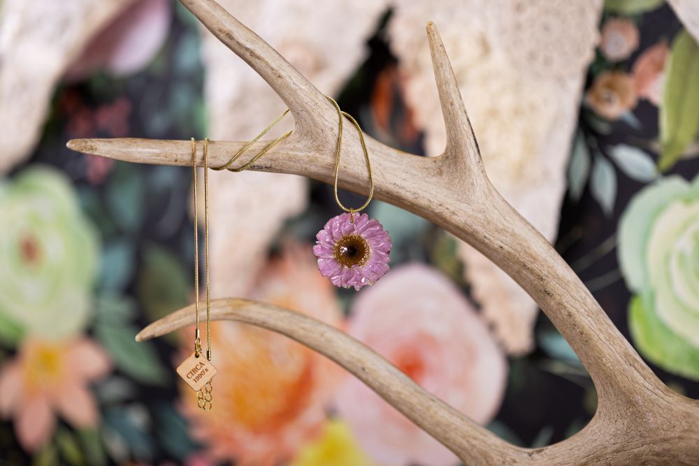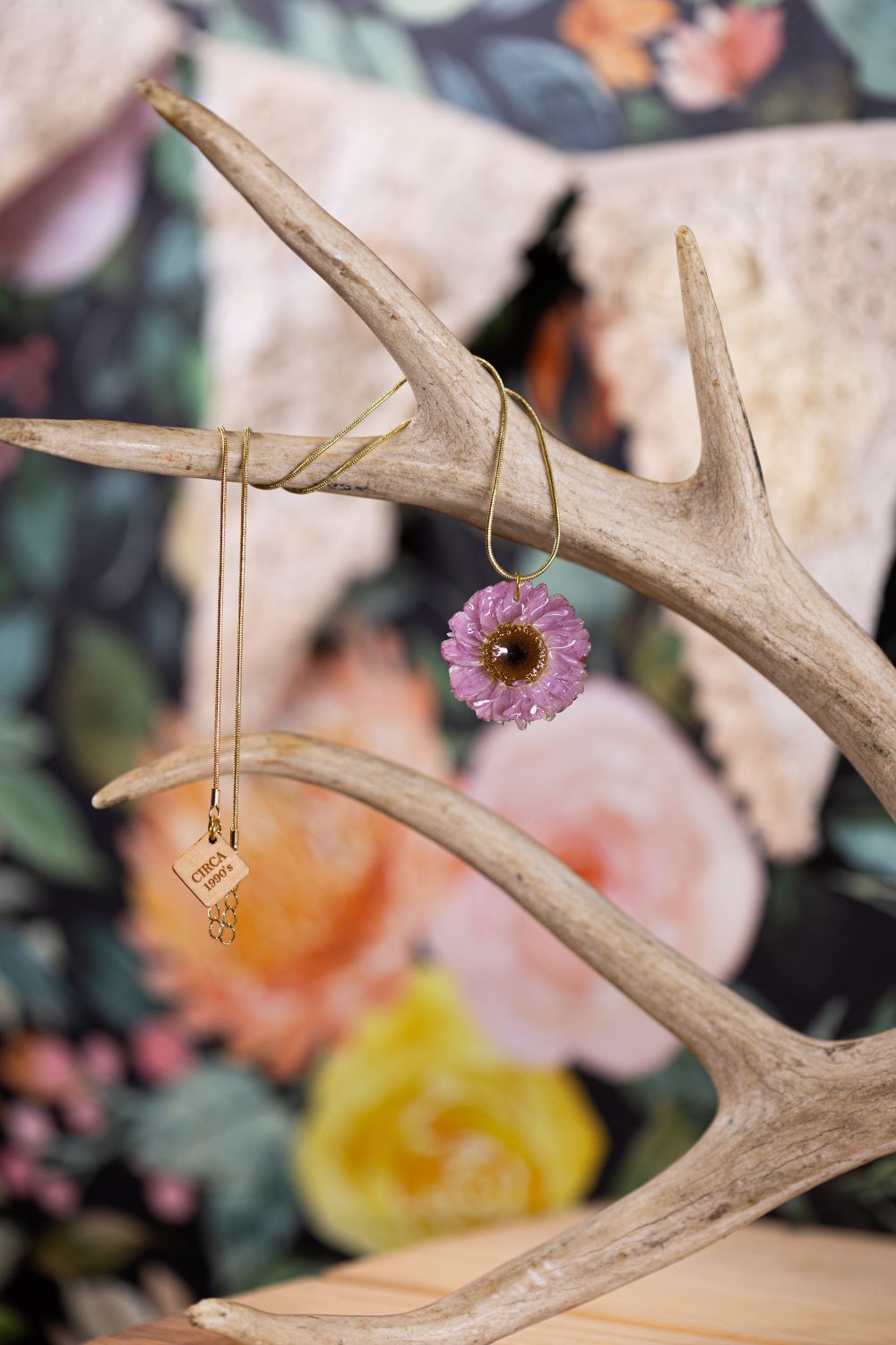The chain used is a 24 inch gold plated brass snake style necklace, adjustable down to 22.5 inches. A laser engraved wood tag displays the year of the flower on one side and our logo on the other! (Standardized picture of tag shown).