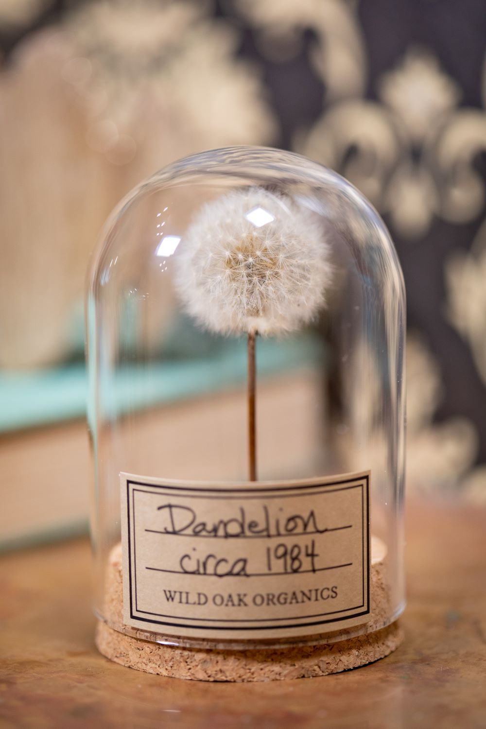 These dandelion seed puffs are from 1981, 1983 OR 1984 and are displayed in a small or large cloche. These flowers were grown on our farm in Southern California.
