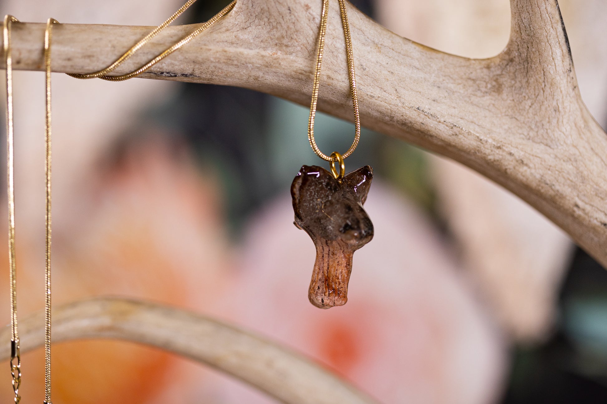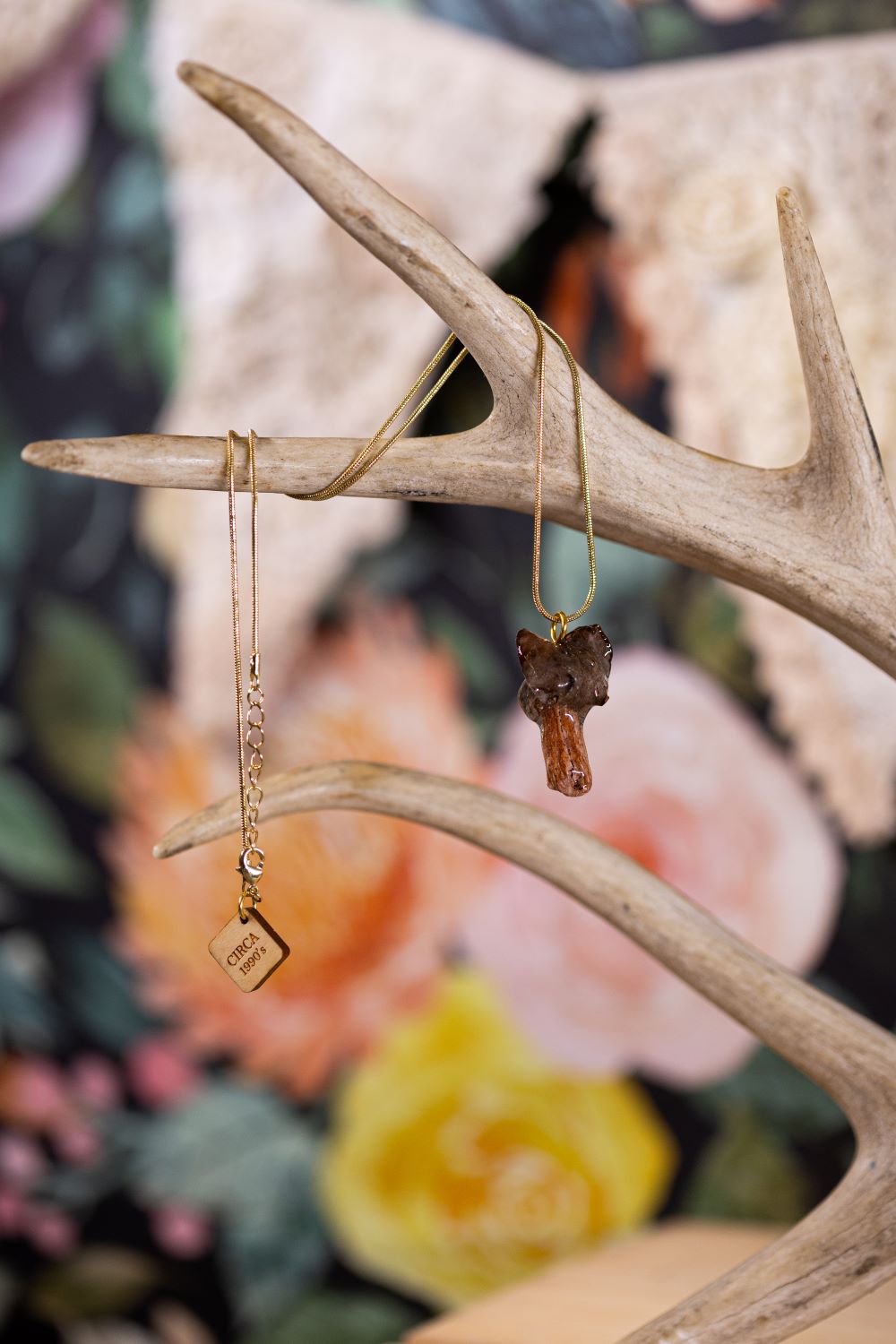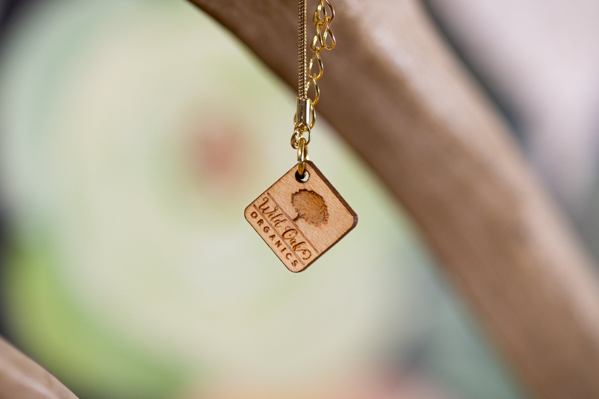 The chain used is an 18 inch gold plated brass snake style necklace, adjustable down to 16.5 inches. A laser engraved wood tag displays the year of the flower on one side and our logo on the other! (Standardized picture of tag shown).