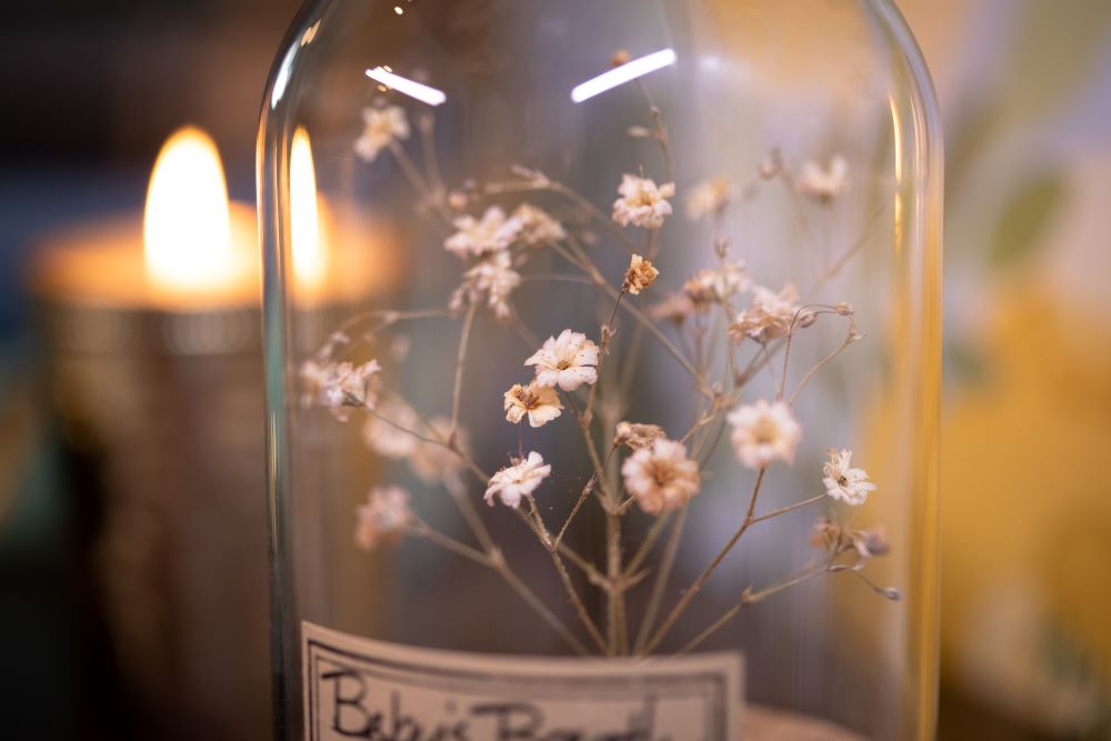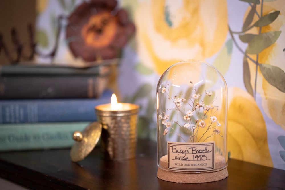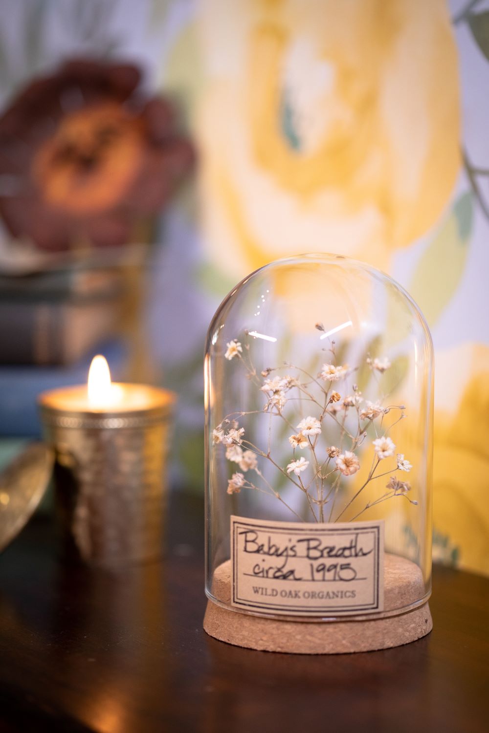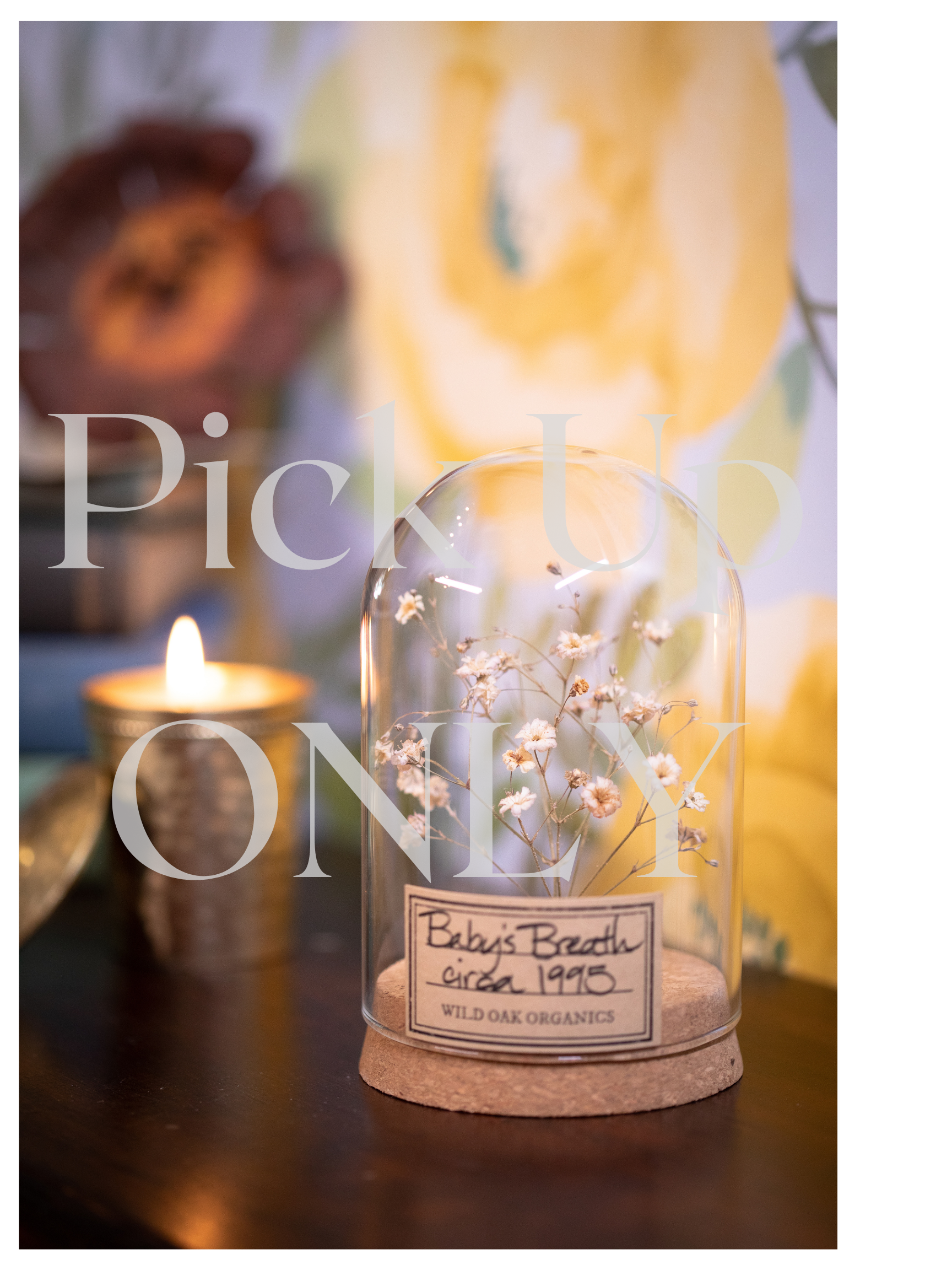 This item is an actual sprig of Baby's Breath flowers from 1995 displayed in a small or large cloche. These flowers were most likely grown on our farm in Southern California.