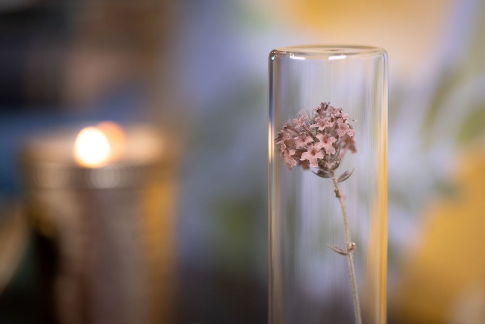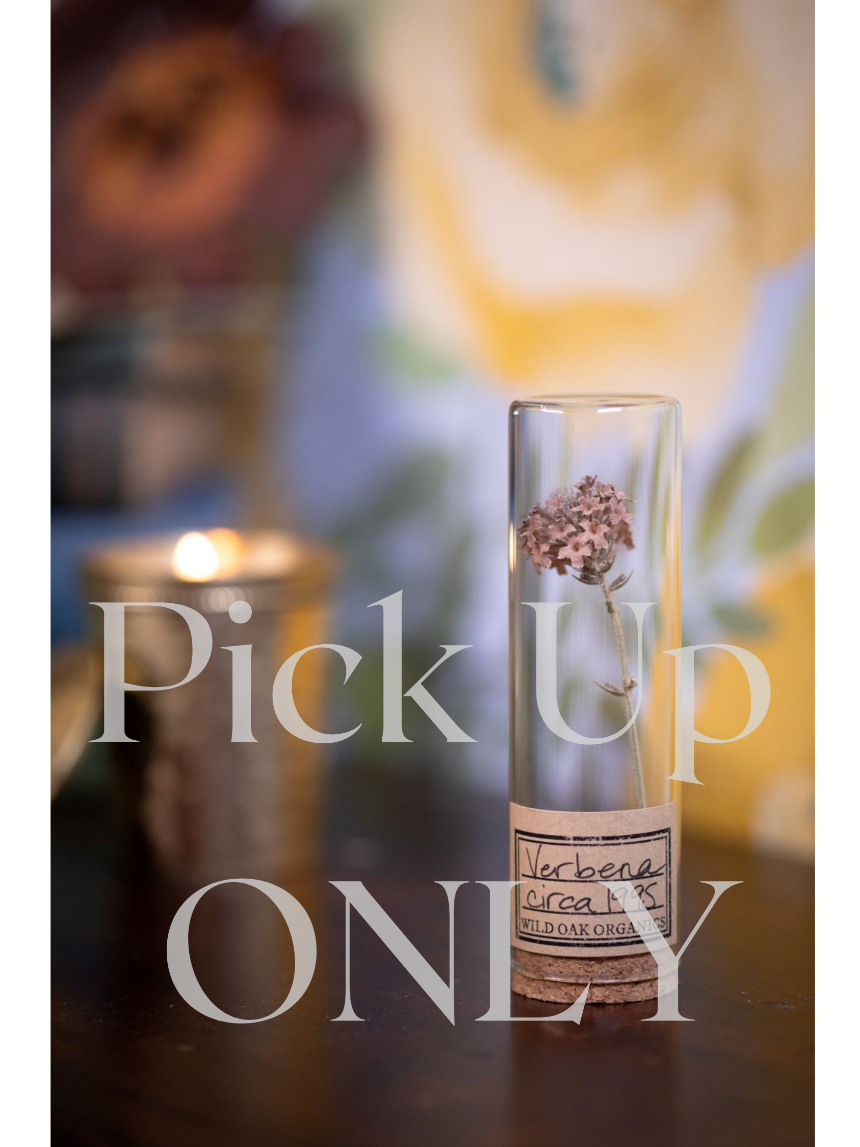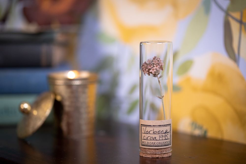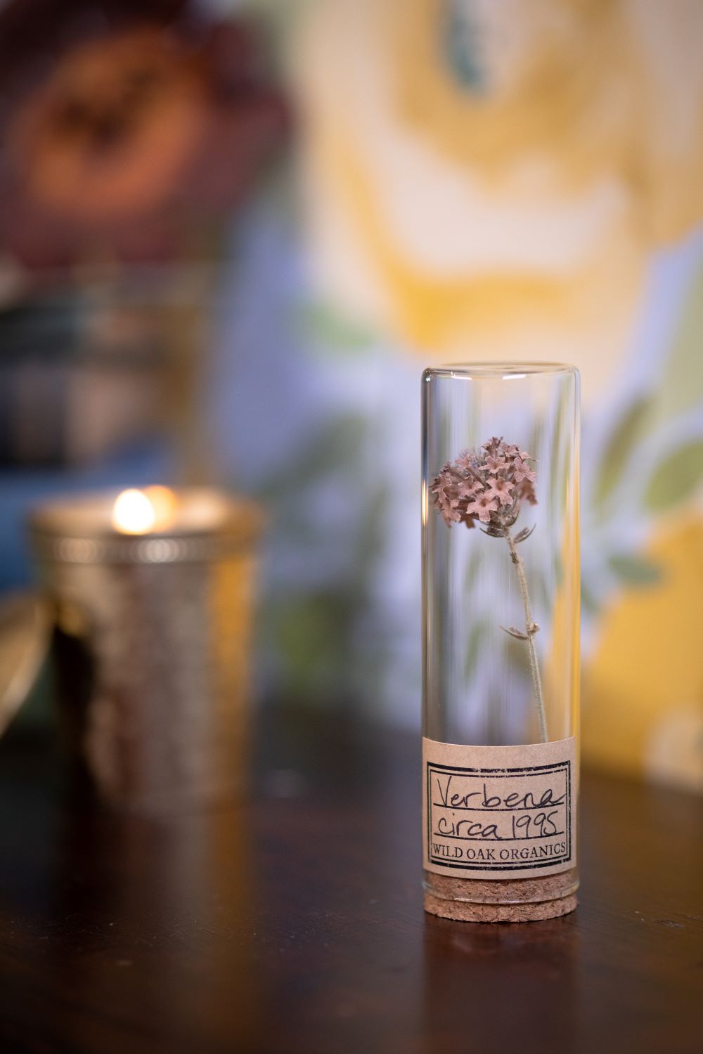 This is an actual stem of Verbena from 1995 displayed in a glass vial. These flowers were most likely grown on our farm in San Diego.