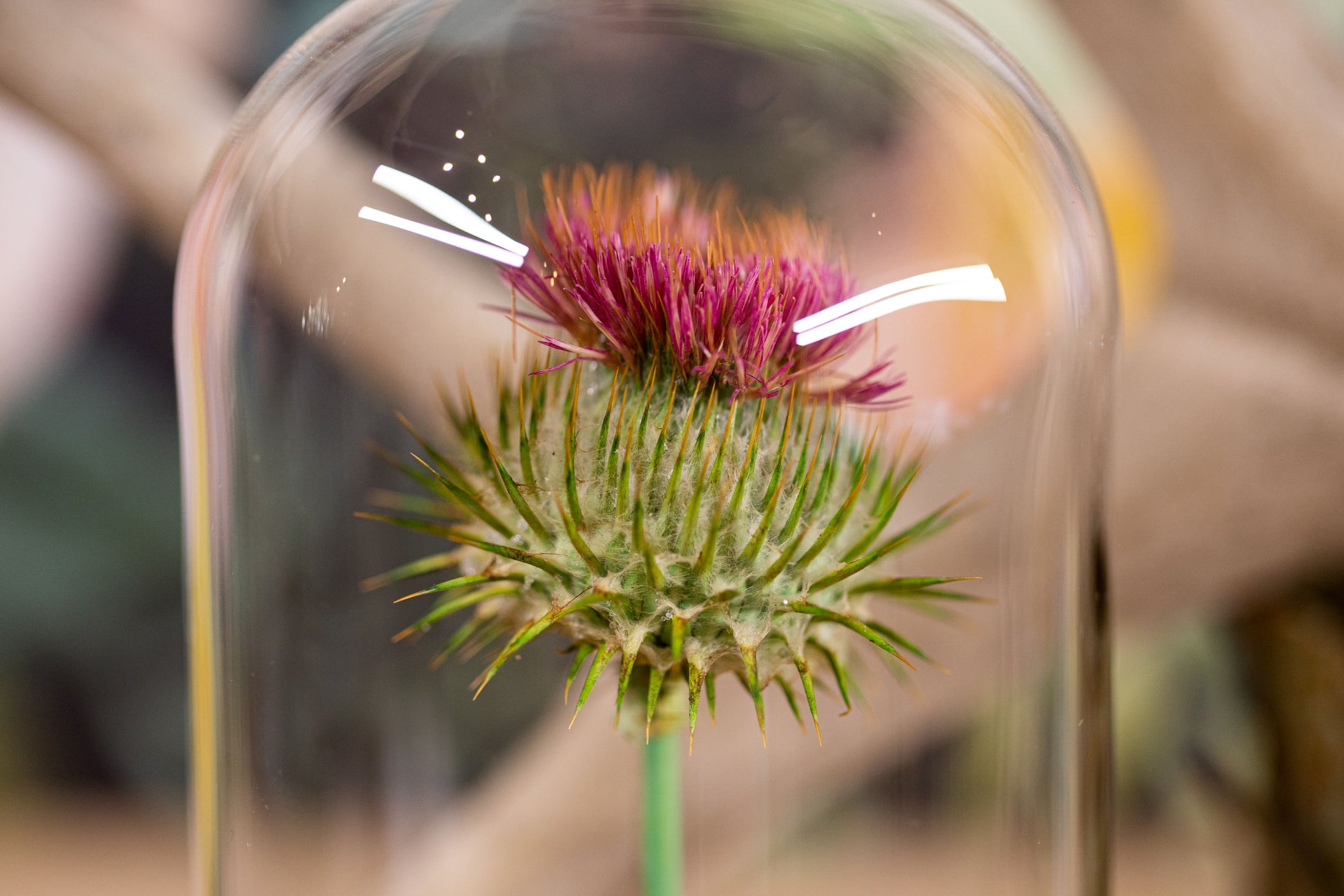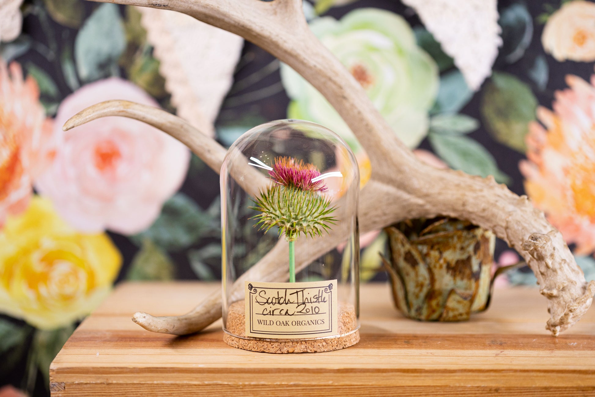 This item is a stem of Scotch Thistle from 2010 and is displayed in a large cloche. These flowers were grown on our farm in Southern California.