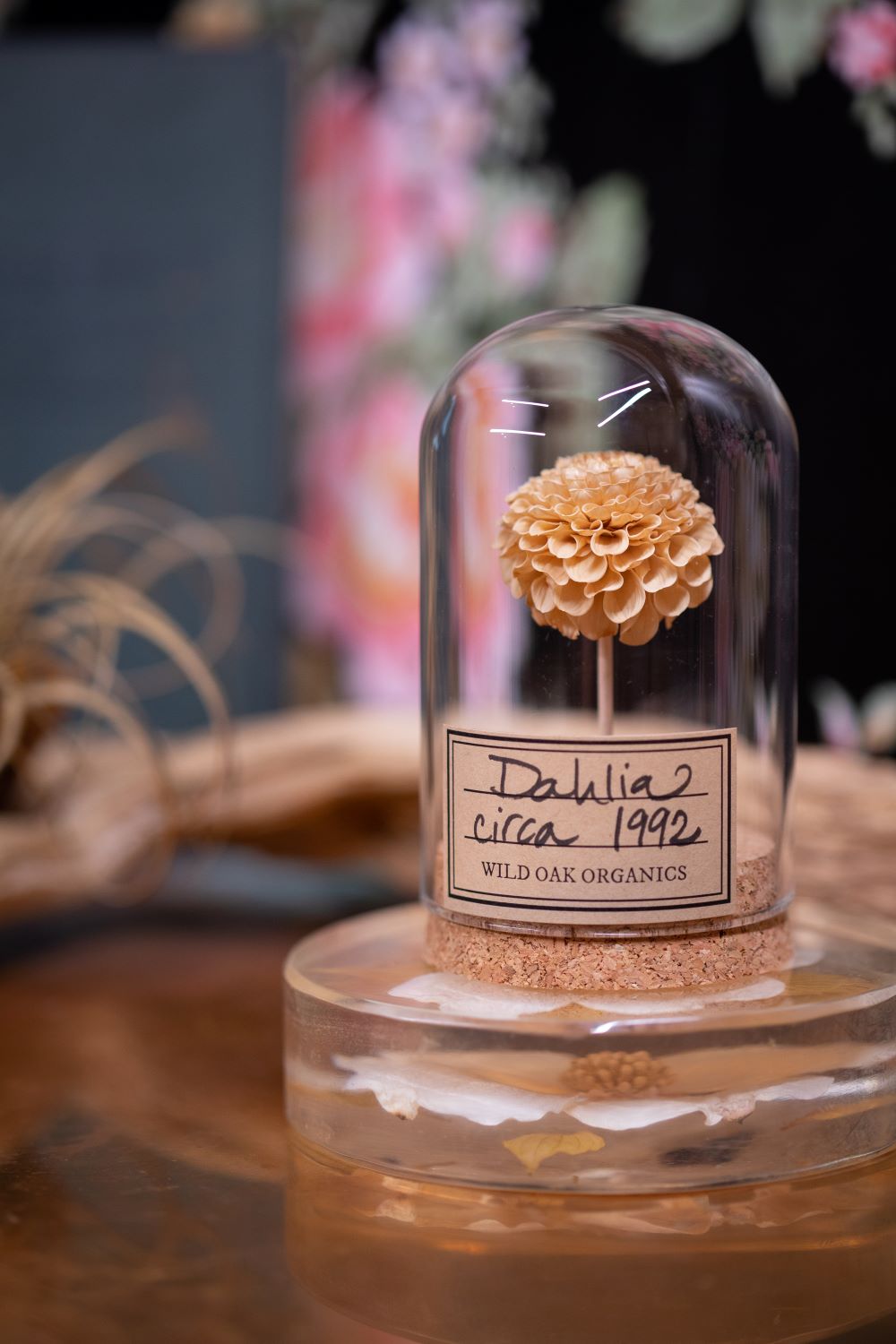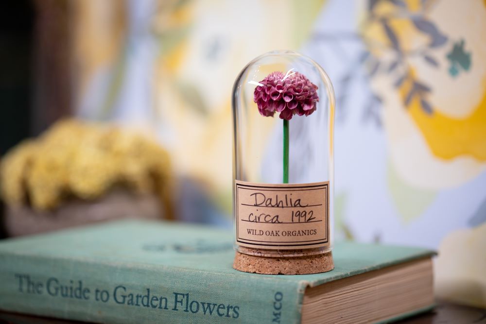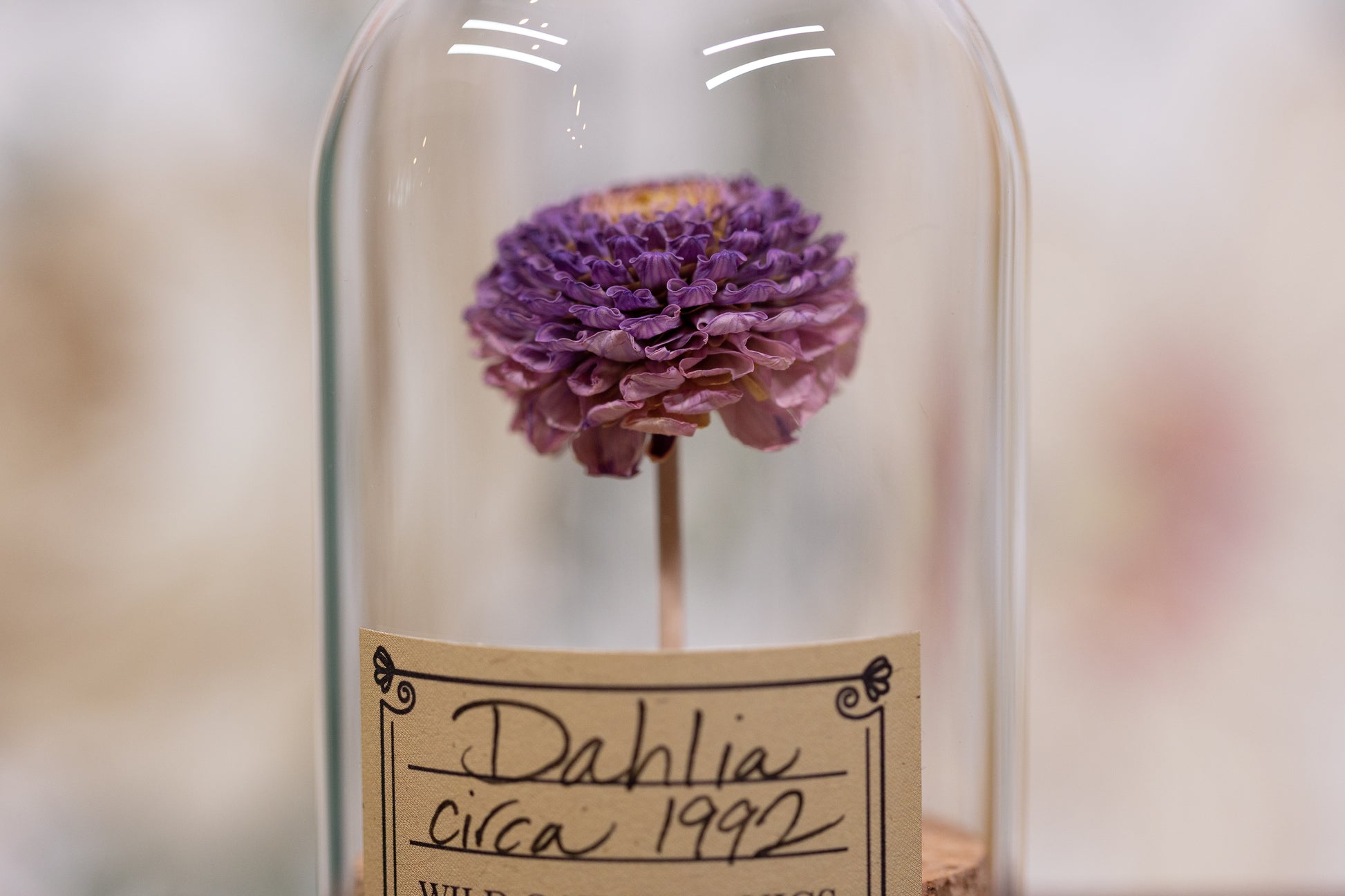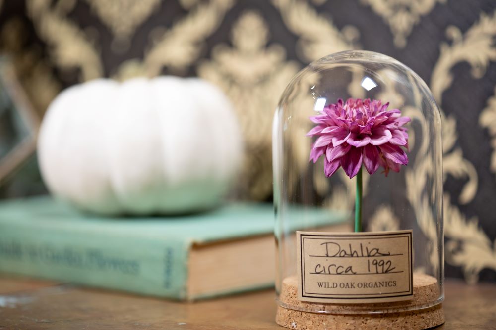 This item is an actual Dahlia flower from the 1990’s, 1992, 1993 OR 1994 displayed in a small, skinny small, or large cloche. Please note the stem is a natural elongated toothpick (no longer dyed as pictured). These flowers were most likely grown on our farm in Southern California.