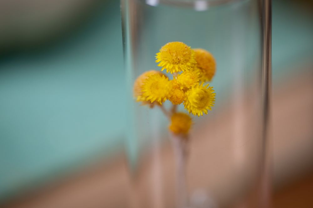 This is an actual stem of Yellow Buttons flowers from the early 2000's displayed in a glass vial. These flowers were most likely grown on our farm in Southern California.